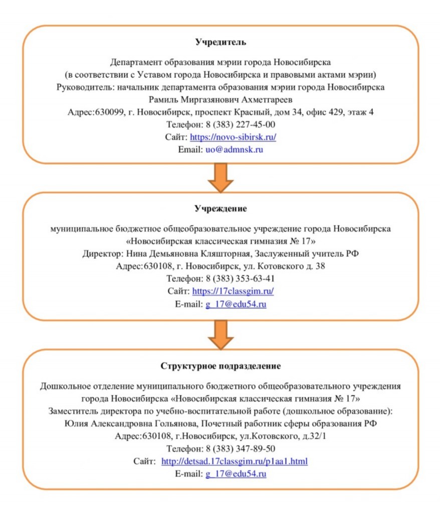Дошкольное отделение муниципального бюджетного общеобразовательного учреждения города Новосибирска «Новосибирская классическая гимназия № 17» является структурным подразделением муниципального бюджетного общеобразовательного учреждения города Новосибирска «Новосибирская классическая гимназия № 17». Не является юридическим лицом.