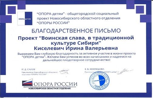 16 декабря в Новосибирске подвели итоги деятельности общегородского социального проекта «ОПОРА - детям» Новосибирского областного отделения Общероссийской организации «ОПОРА РОССИИ» за 2024 год. Торжественное мероприятие состоялось в большом зале мэрии города и объединило представителей власти, предпринимателей, общественных деятелей, участников и партнеров. Дошкольное отделение МБОУ "Новосибирской классической гимназии №17" также принимает активное участие в реализации проекта «Воинская слава в традиционной культуре Сибири» под руководством музыкального руководителя -Киселевич Ирины Валерьевна и воспитателя- Артемьевой Натальи Александровны