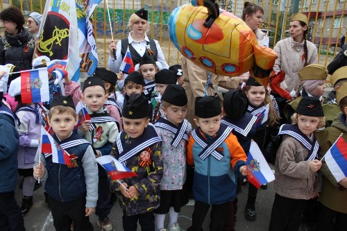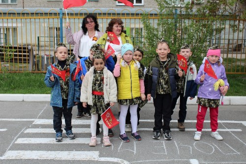 Звучали песни военных лет, создавая особую атмосферу патриотизма и уважения к подвигу советского народа. Воспитатели, также одетые в форму военных лет, рассказывали детям о героизме солдат, о тяжелых боях и о долгожданной Победе.