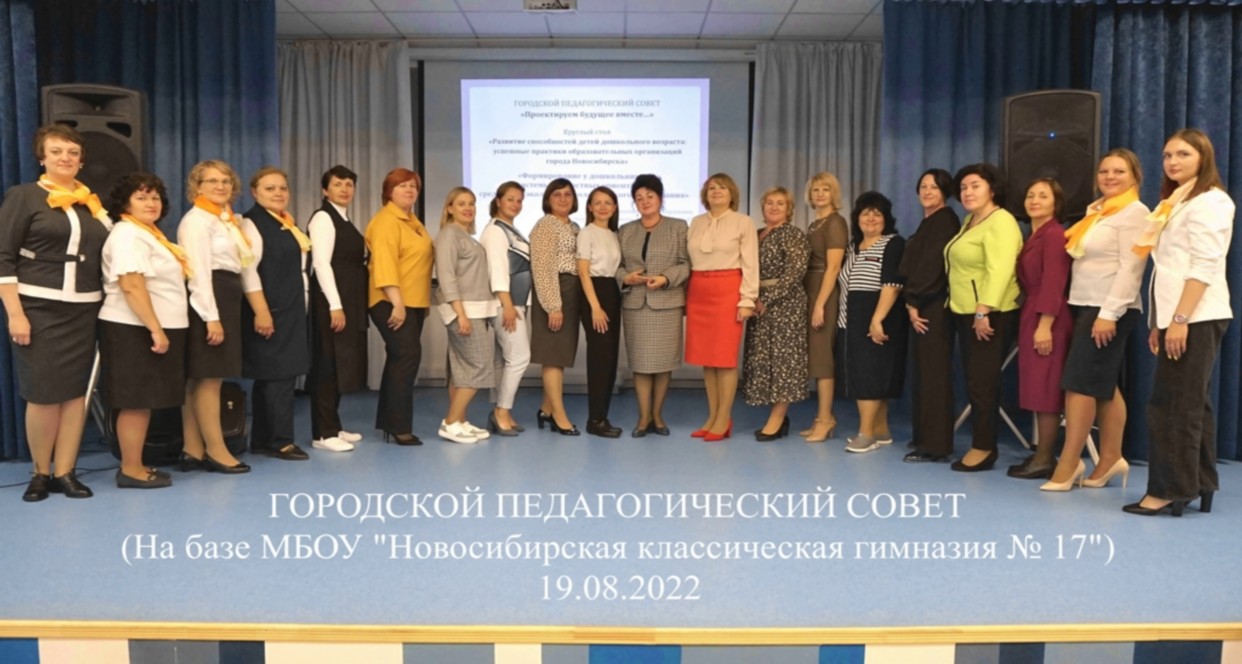19 августа 2022 года в актовом зале нашей гимназии прошел городской педагогический совет: «Проектируем будущее вместе…», инициированный Департаментом образования мэрии города Новосибирска и МАУ ДПО «Новосибирский Институт Современного Образования». В рамках Круглого стола была освещена тема: «Развитие способностей детей дошкольного возраста: успешные практики образовательных организаций города Новосибирска». Модераторами, спикерами и экспертами выступили: Диринг Елена Борисовна, начальник отдела дошкольного образования управления общего и дополнительного образования ДО мэрии города Новосибирска; Копаева Наталья Николаевна, старший методист-эксперт МАУ ДПО «НИСО»; Климова Лариса Юрьевна, старший методист МАУ ДПО «НИСО». Опытом работы поделились 10 человек, целевую аудиторию составили более 150 педагогов дошкольного образования.